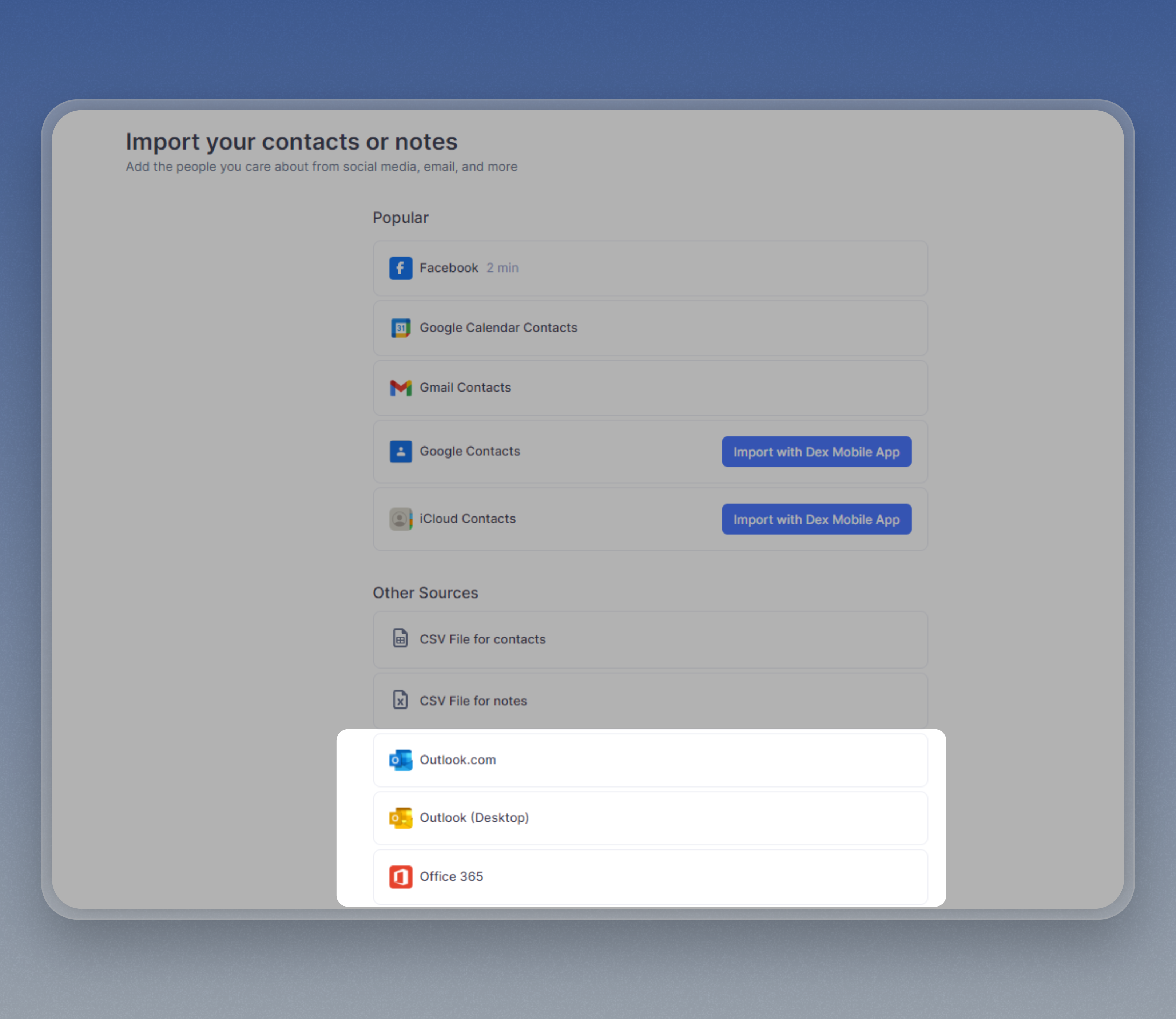 You can go to the import page here. On the list of sources under ‘Other Sources’, click on ‘Outlook.com’, ‘Outlook (Desktop)’, or ‘Office 365’ depending on which version of Outlook you’re using.