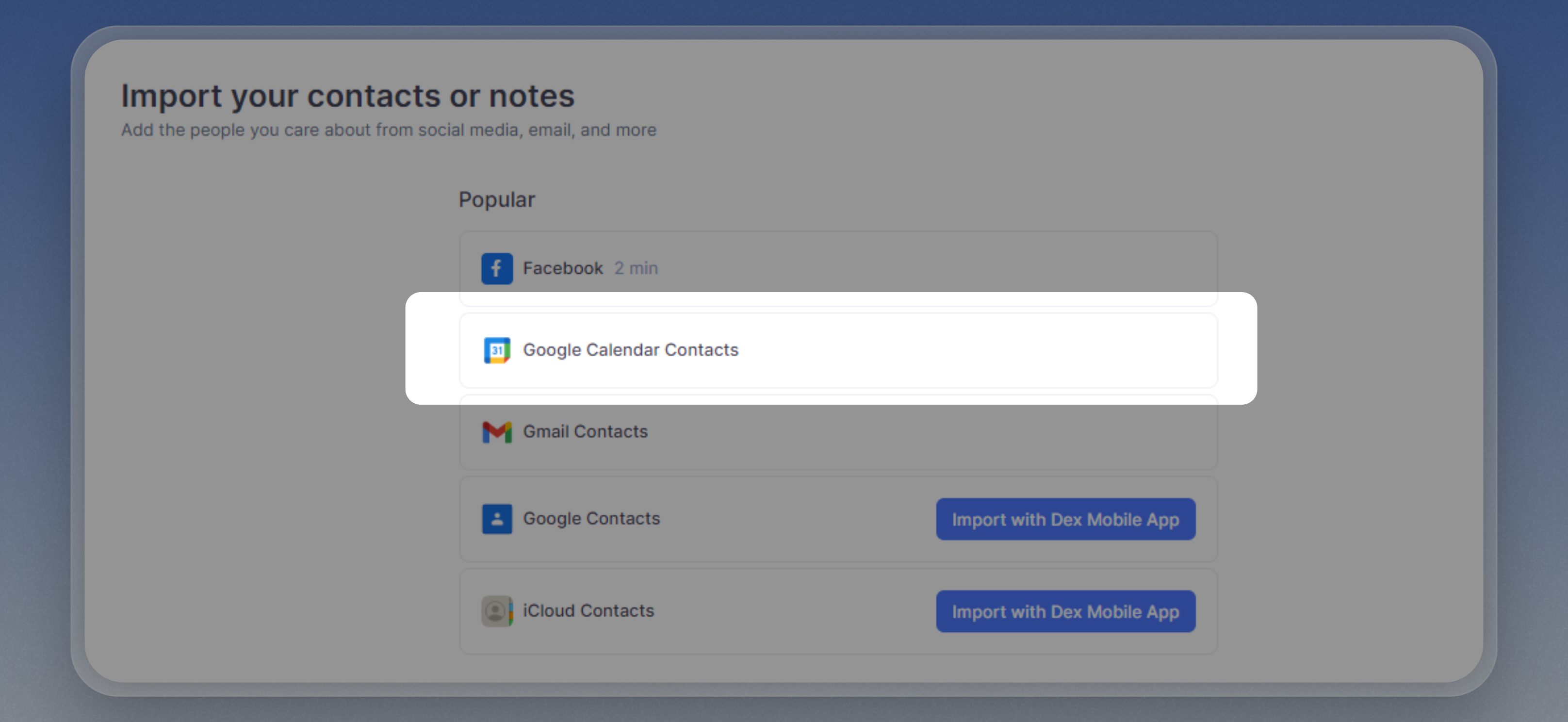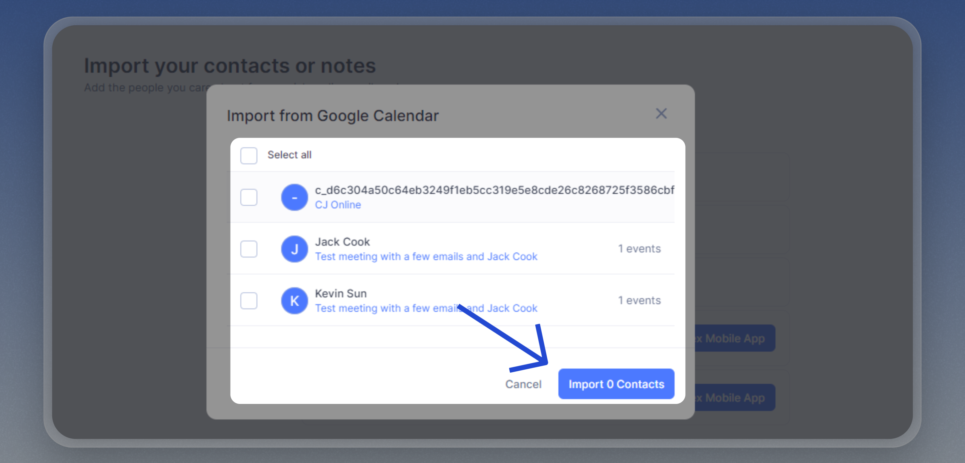 If you haven’t yet, make sure to import your Google Calendar Contacts on the Import page
