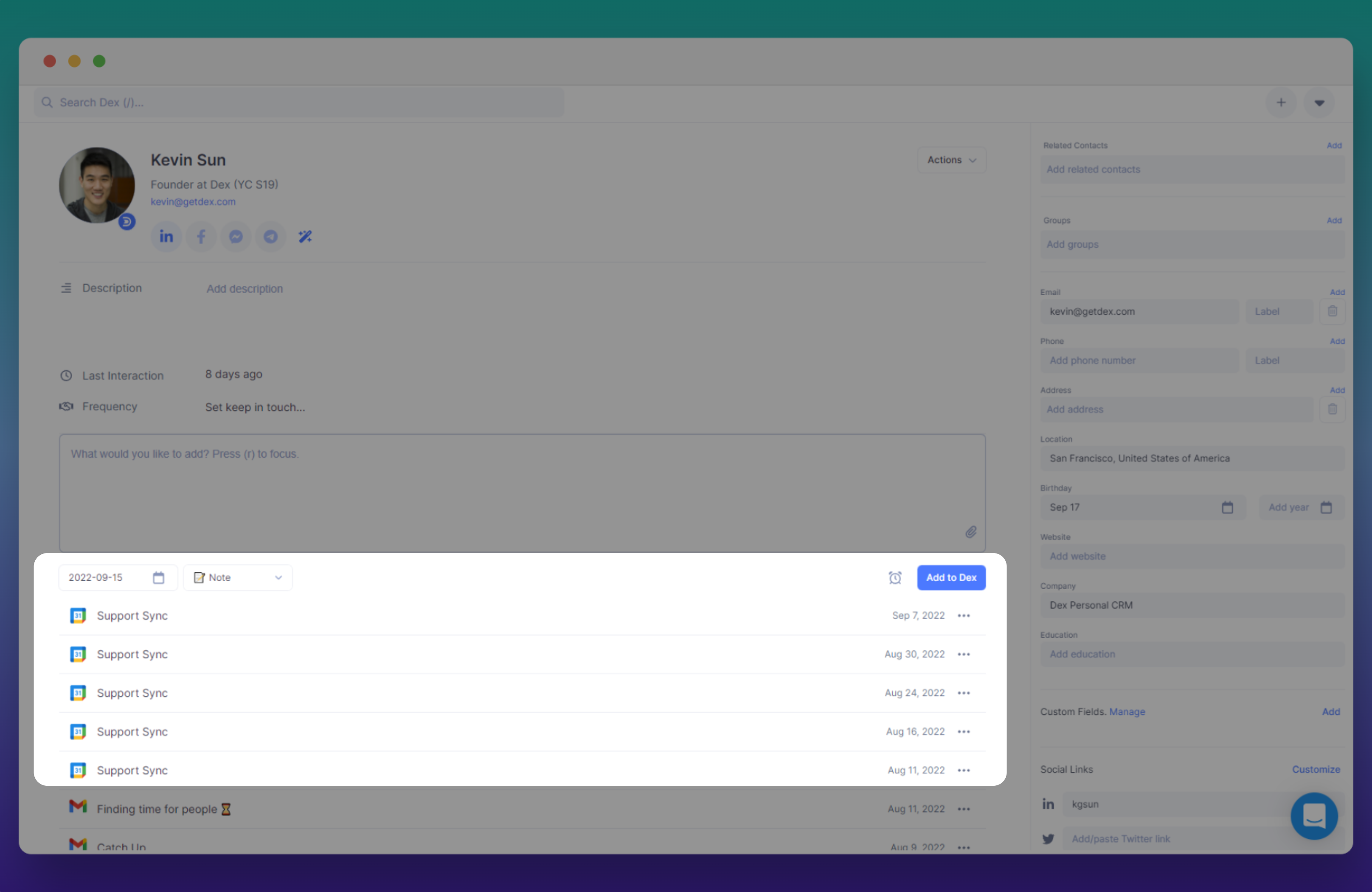 - Smarter contact linking: Dex matches contacts based on email address or calendar attendee name