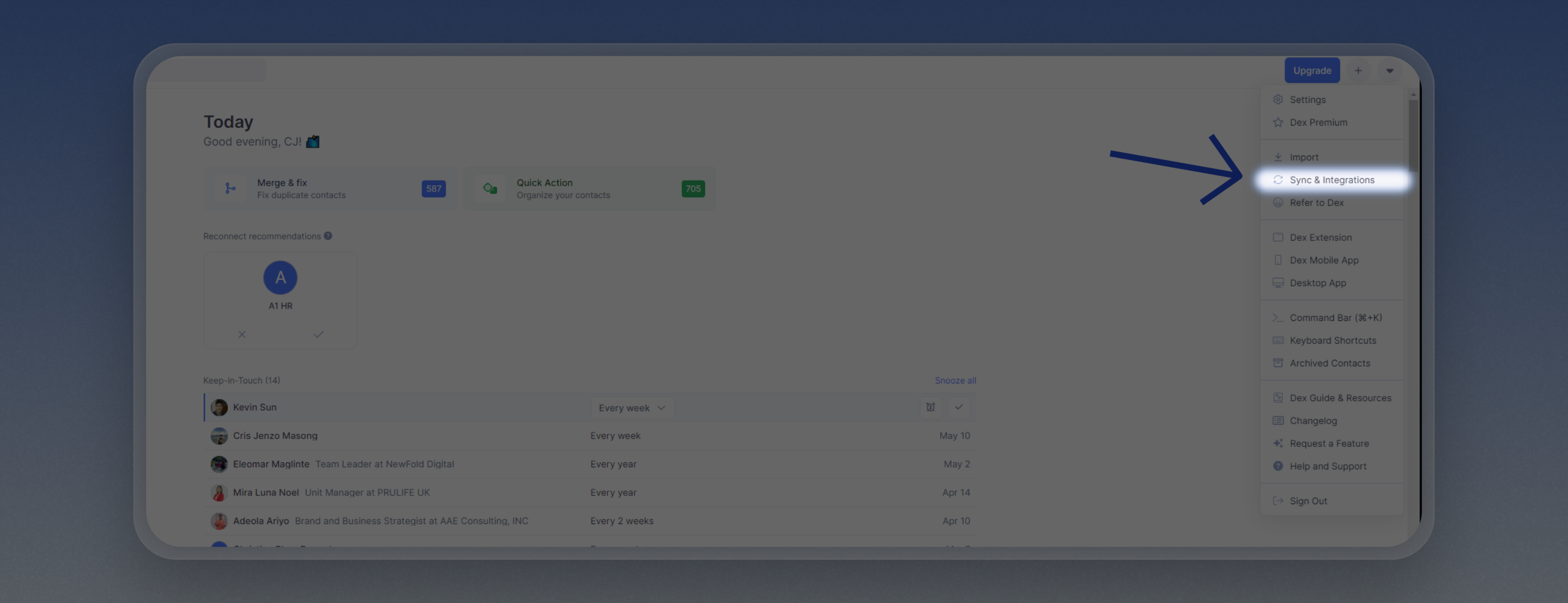 From the home page, click the dropdown icon at the top-right corner and choose Sync & Integrations.\