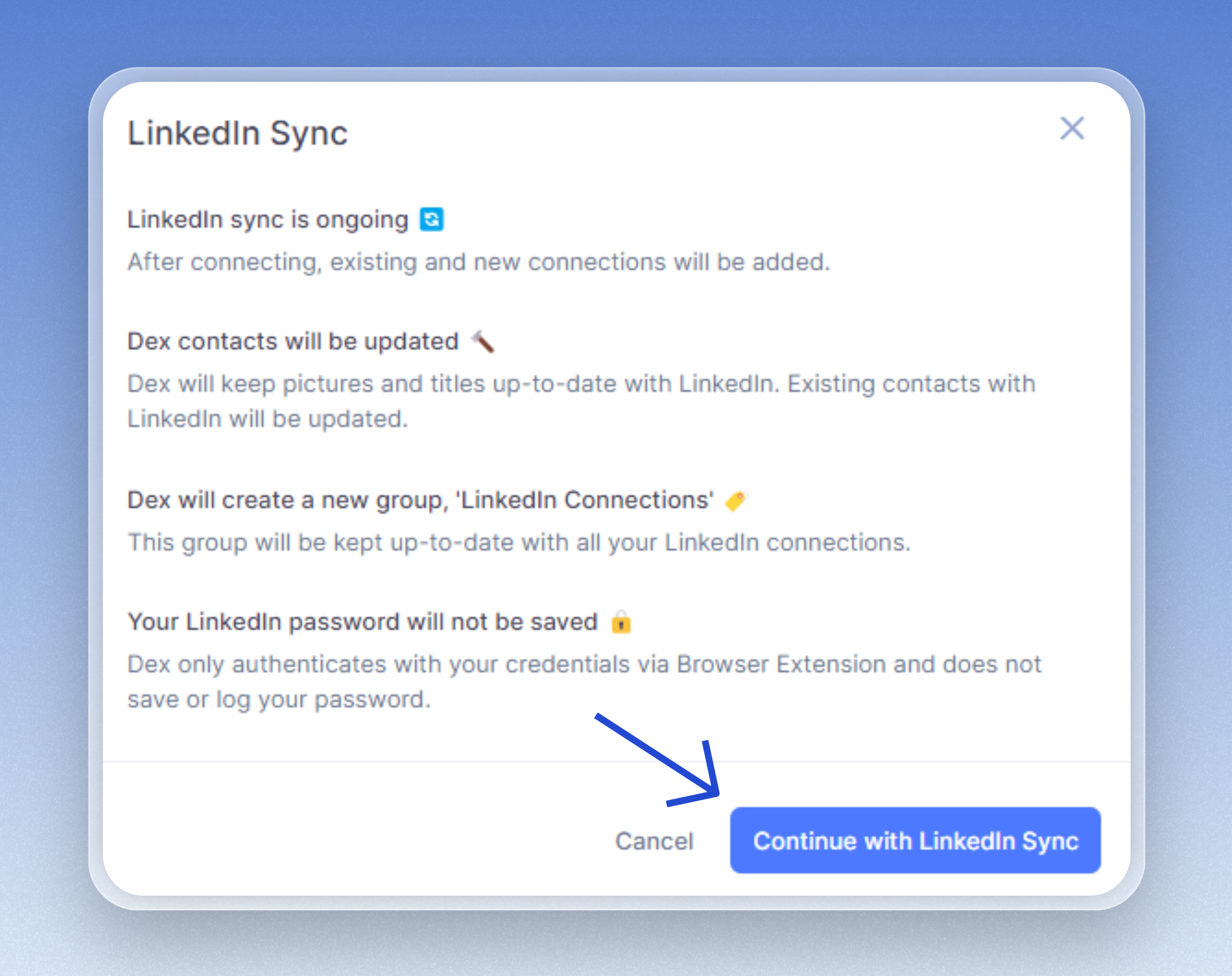 - 🔨LinkedIn Connections will be seamlessly added to Dex and kept up-to-date every 3-5 days. We’ll automatically update your contacts’ titles, pictures, and more continually.
