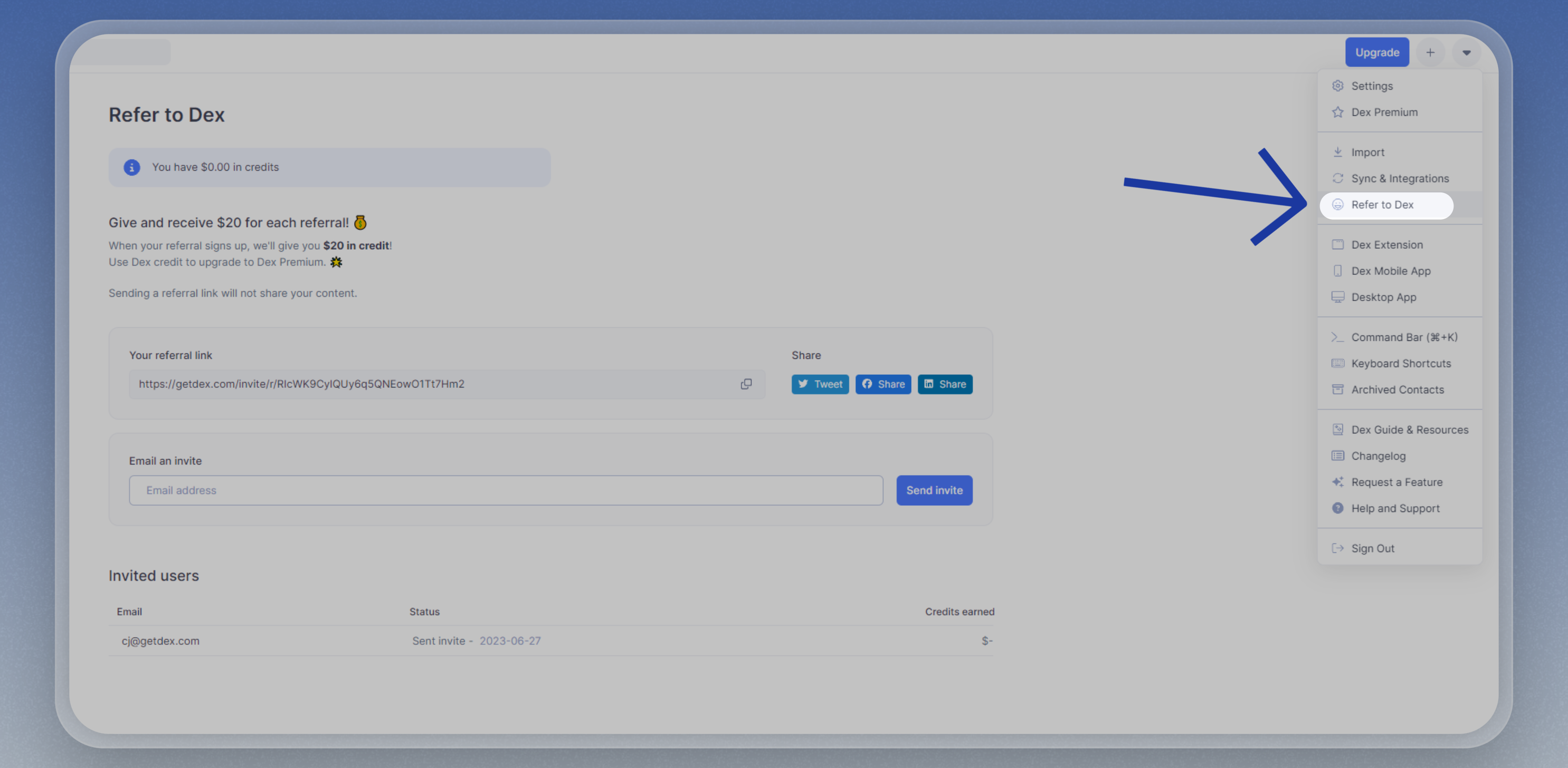 You can go to the Referral page through the drop-down menu and clicking on โRefer to Dexโ.