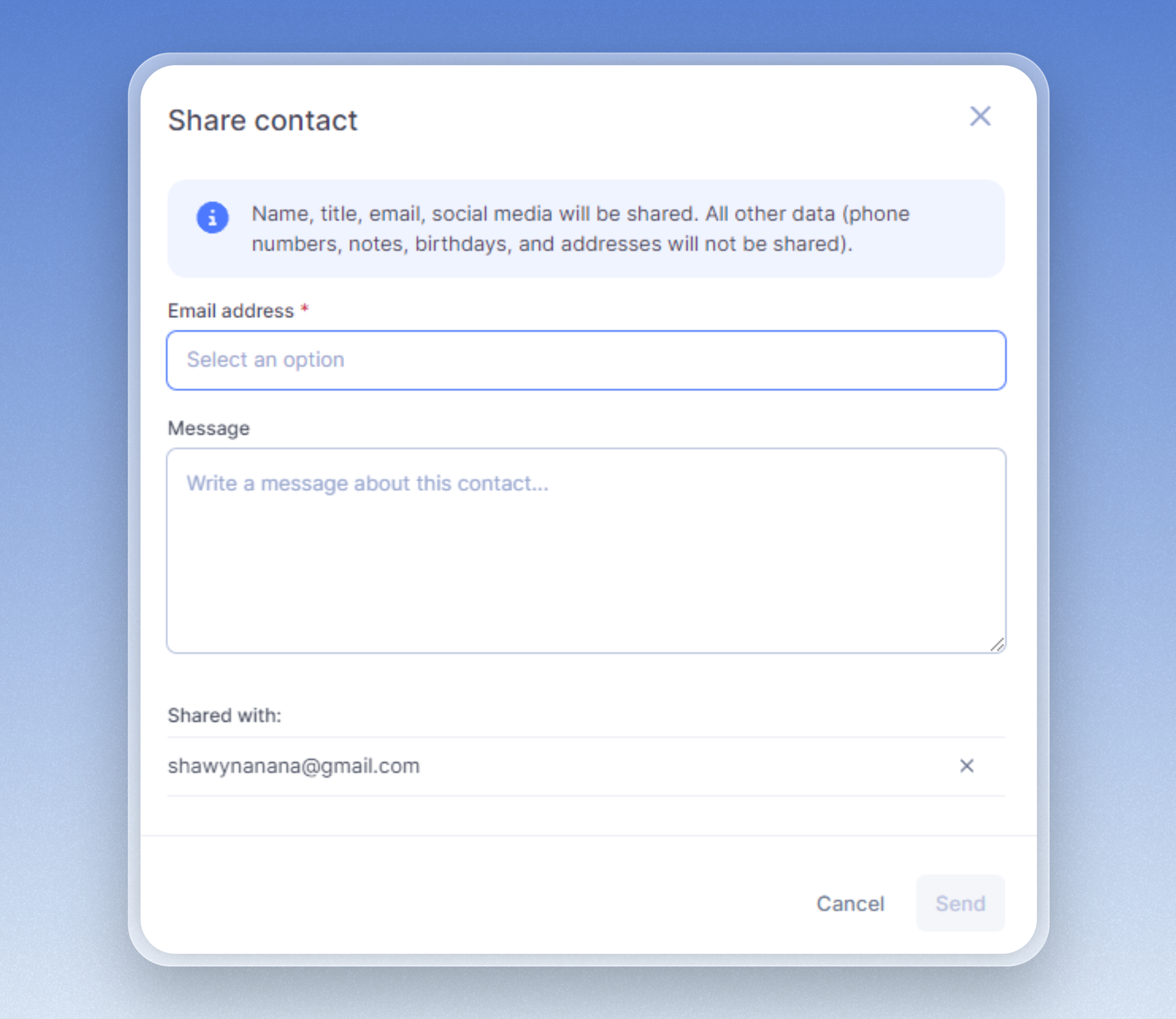 - Shared details of a contact is only limited to name, title, email, and social media. The rest like phone number, birthday, address, etc will not be shared.