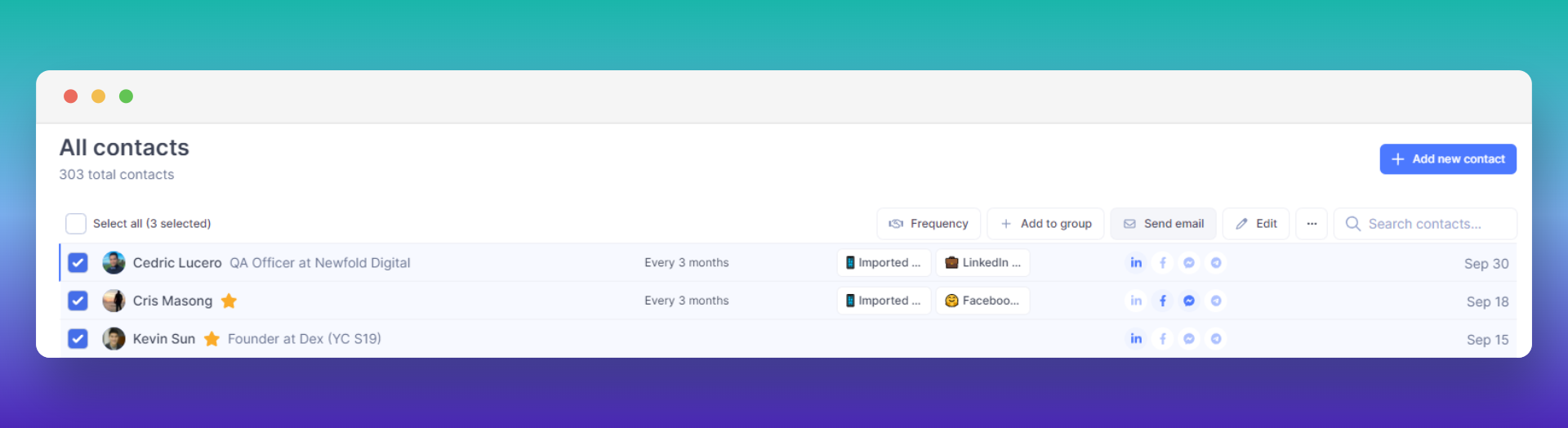From Dex, easily send emails to individual contacts or in bulk!On the Contacts page, select the contacts you want to send an email to: