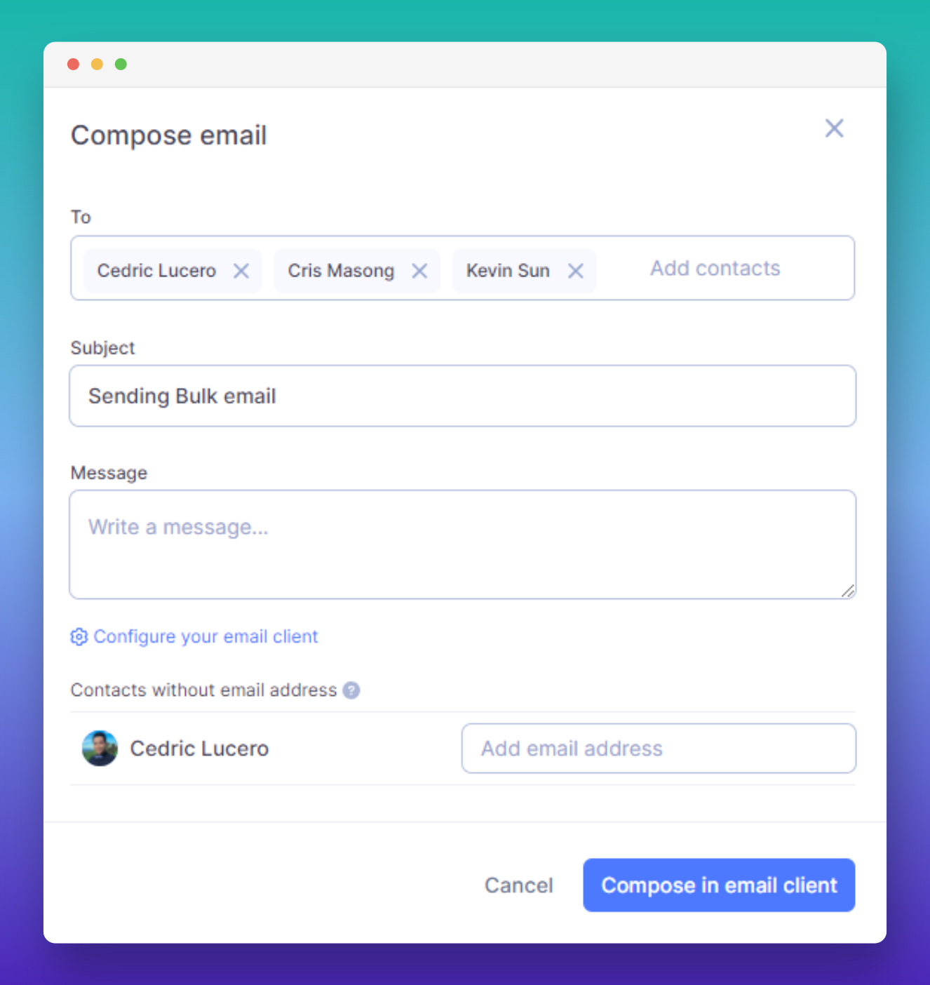 After drafting a message, click the ‘Compose in email client’ button to open your email client of choice.You can also send an email from the contact’s card by going to ‘Actions’ > ‘Send email’: