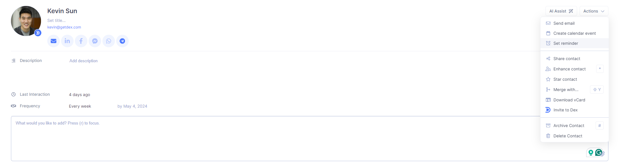 While on a contact’s profile, you can create a reminder by going to the ‘Actions’ drop-down.