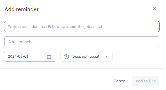On the Dex website or mobile app, easily see upcoming reminders and mark them as complete through the reminders page.