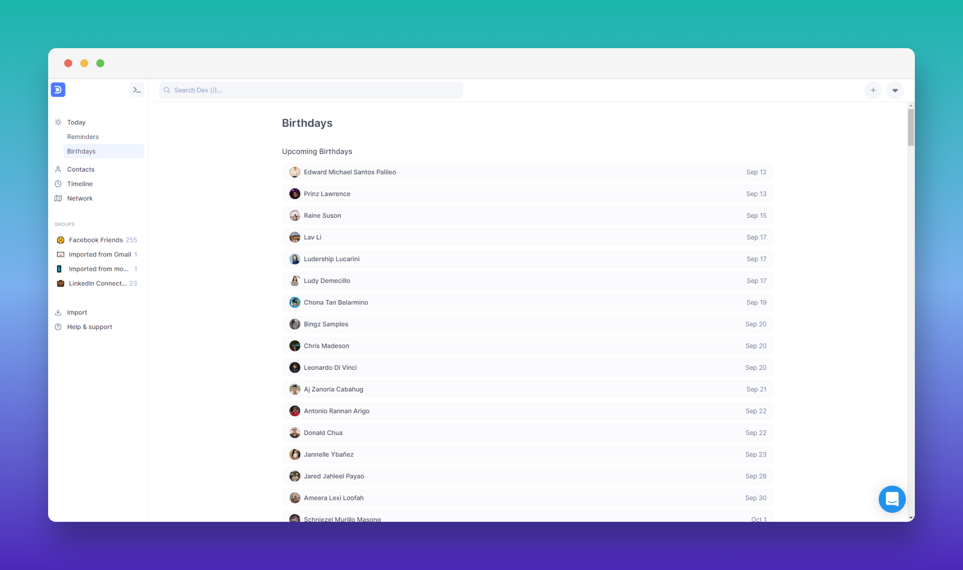 Once your birthdays are imported, you can easily access them from the Birthdays page in Dex: