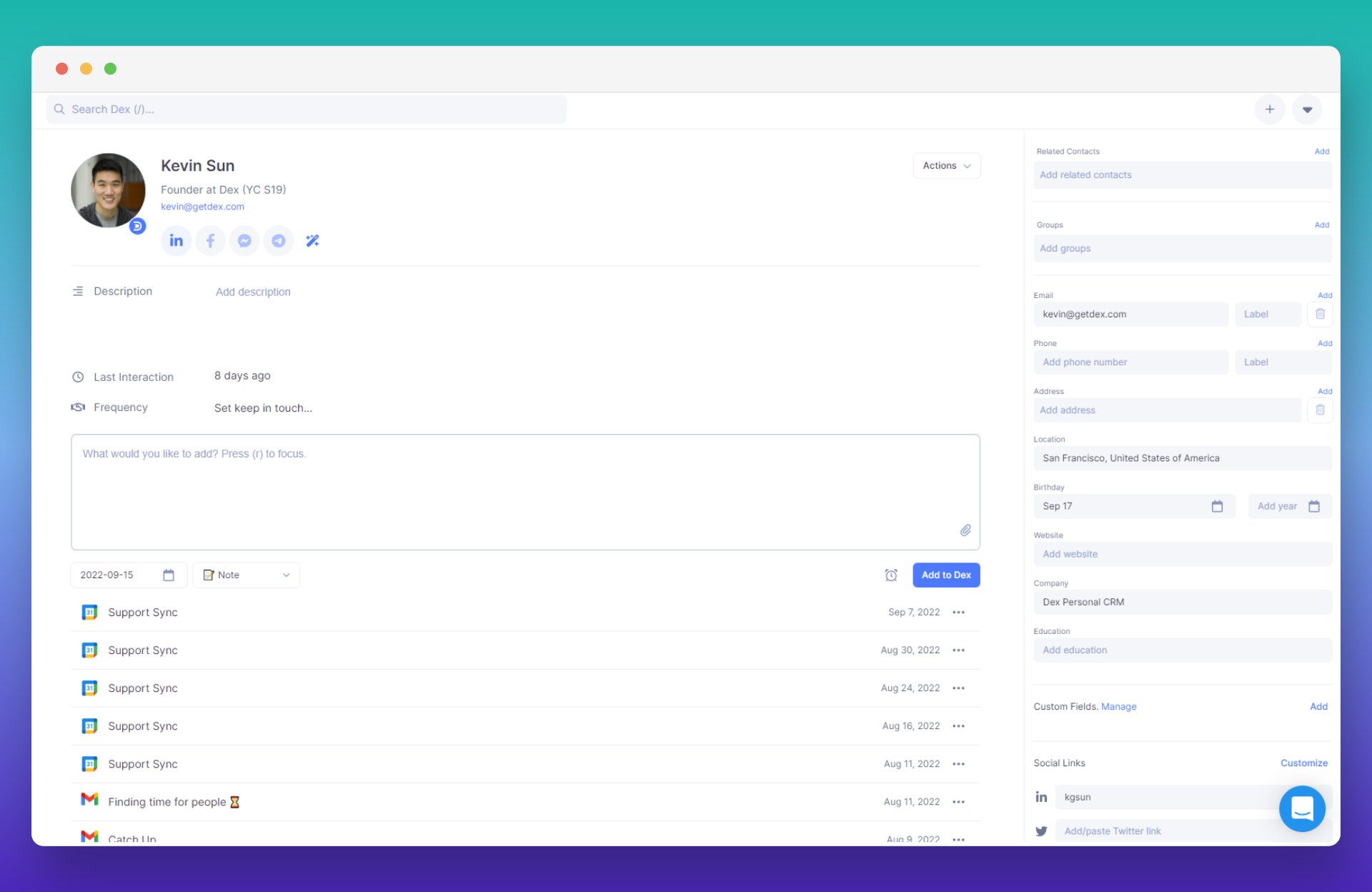 Dexβs integration with your Gmail Account streamlines your communication flow, letting you view relevant threads, update the last interaction, and get a complete picture of where you left off. Learn how to set this up in the Gmail Account Sync Guide